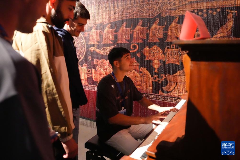 9月23日,一名西班牙格拉纳达大学队球员在世界音乐文化博物馆内弹钢琴。新华社记者 郑焕松 摄