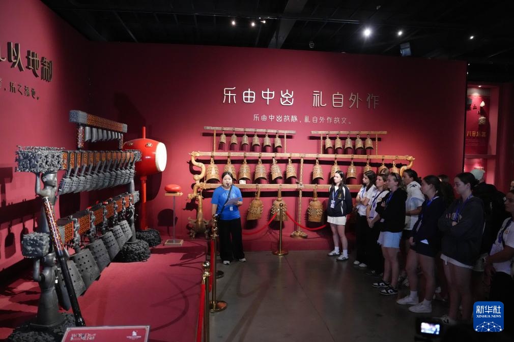 9月23日,球员们在世界音乐文化博物馆聆听讲解员介绍编钟。新华社记者 郑焕松 摄
